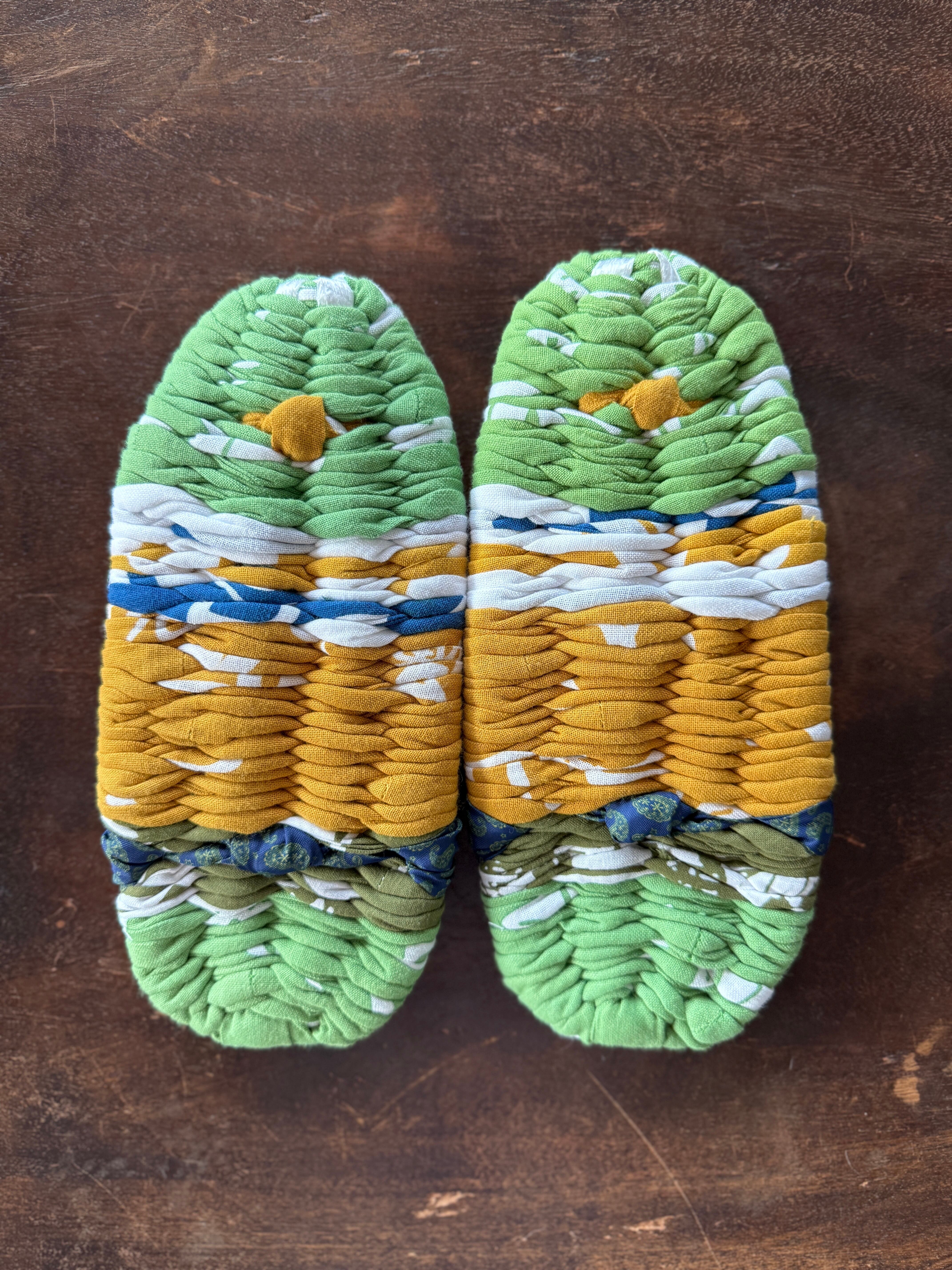 手ぬぐいの端切れを使って編んだ布草履は、通気性もよく、丸洗いも可能。履いていくとそれぞれの足に馴染みフィットしていく経年変化も楽しめます。職人さんによる手編みのため、同じ色・形のものはございません。この機会にお気に入りの一足を見つけてください。