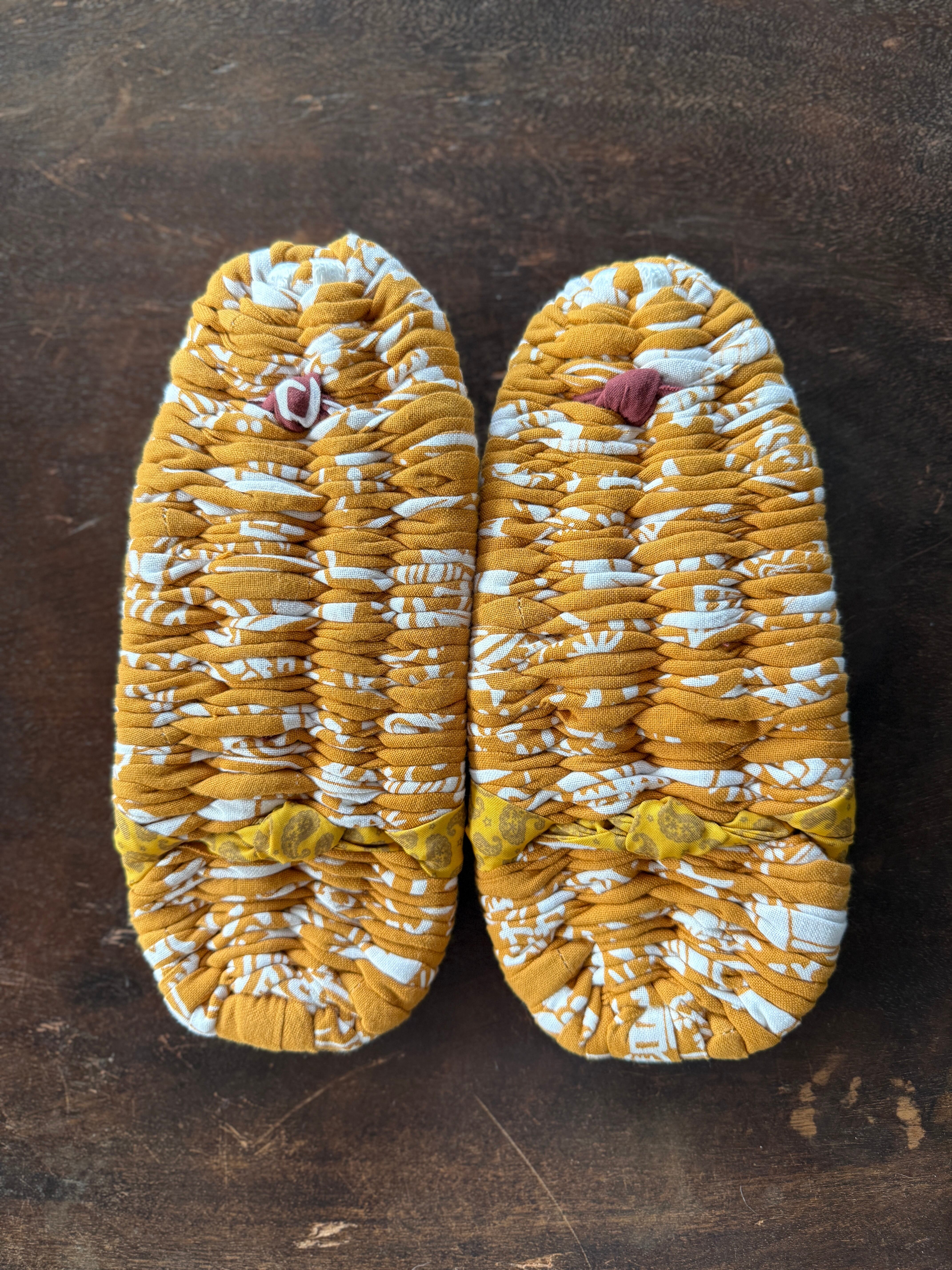 手ぬぐいの端切れを使って編んだ布草履は、通気性もよく、丸洗いも可能。履いていくとそれぞれの足に馴染みフィットしていく経年変化も楽しめます。職人さんによる手編みのため、同じ色・形のものはございません。この機会にお気に入りの一足を見つけてください。